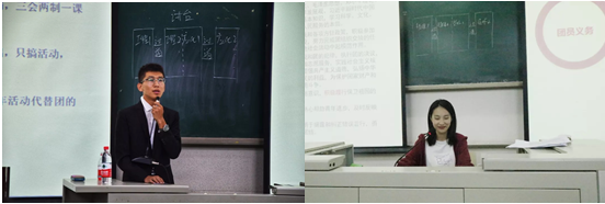 郭贵川老师通过画A4人生格子的方法让团员们认识到时光的宝贵和规划人生未来的重要性。姬谦龙老师从“大学的美丽”、“大学的惆怅?”和“什么是团?”等方面与同学们进行了交流。由校团委干部赵立博和朱雪骐围绕“基层建设的形势”、“基础团务串讲”和“团的基本章程”深入剖析,团员们更加清晰的了解了团的相关知识。
