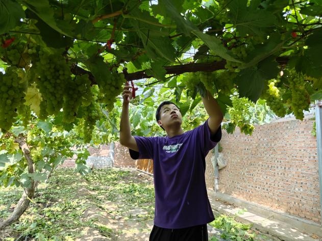 夏天气温较高,光照强烈,作物易出现徒长的现象,这时就需要及时对作物进行摘心。葡萄摘心可以合理调节植株体内营养物质的均匀分配和运输,使养分集中供给有效花果的需要,减少养分消耗,有效提高葡萄的坐果率。7月8日,金粟种植专业合作社刘师傅向小院学生崔武琦和欧梦喆讲解和示范了葡萄摘心的关键点。经过刘师傅耐心教导,小院学生们便开始行动起来。起初俩人的效率并不高,一旁的刘师傅继续指导道“你们别不忍心,就按照我说的方法放心大胆的剪”,经过一段时间的实践,俩人逐渐掌握了葡萄摘心的技术,干得越来越像样。“夏季这些徒长的枝条不仅影响葡萄采光,还浪费营养,你要想尽办法找这些枝条的麻烦,把它剪掉。农业劳动看似简单,其实蕴含着科学原理与自然规律,想要做好还需要实践熟练技术,并理解其中原理。