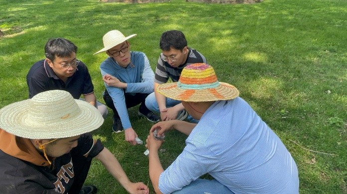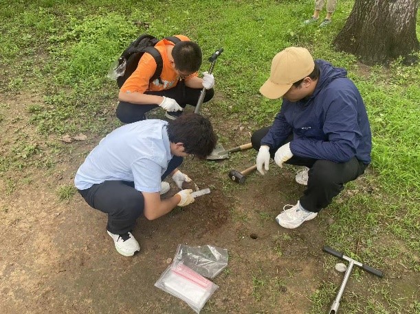在工作的第一周,同学们就体验了闷热多雨的“桑拿天”。实践过程中的天气是多变的,时而阴雨绵绵,时而烈日当空,闷热潮湿的天气给同学们的实践活动带来了不小的挑战。22级资环本科生陈永刚同学感叹道:“这几天的天气特别闷热,每次钻土、挖土、取土都会让我大汗淋漓。有一次土样取到一半突然下起骤雨,只能打伞继续坚持,不然就会前功尽弃。这些经历都是在课堂上体会不到的。” 22级资环本科生阿克力江●阿里木同学说:“这次实践活动让我更加深刻地体会了城市绿地建设者的辛劳。作为农学院的学生,能够为世界遗产天坛公园的绿地质量提升贡献一点力量,我们感到任重道远。”