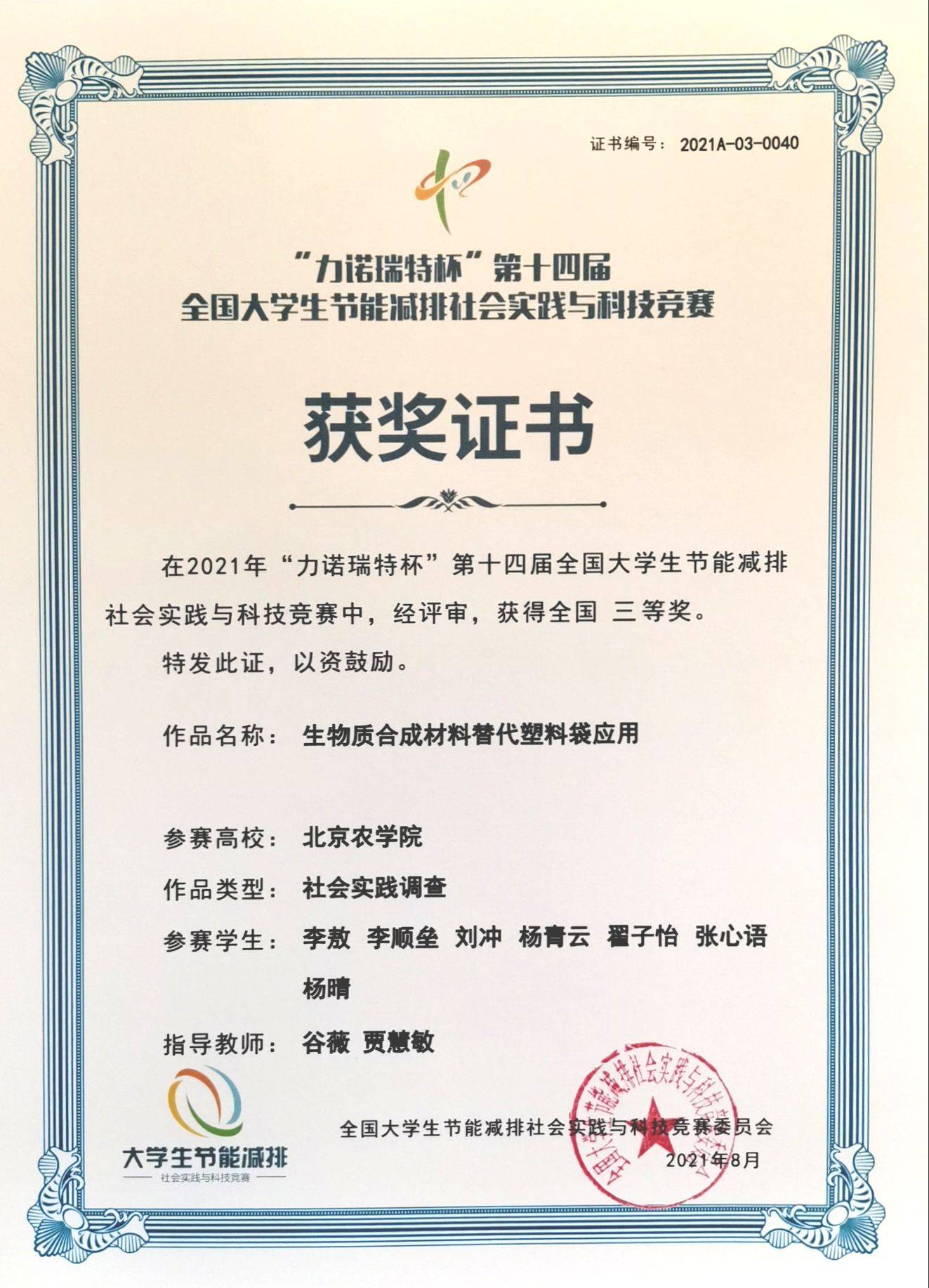 获奖证书:第十四届全国大学生节能减排三等奖