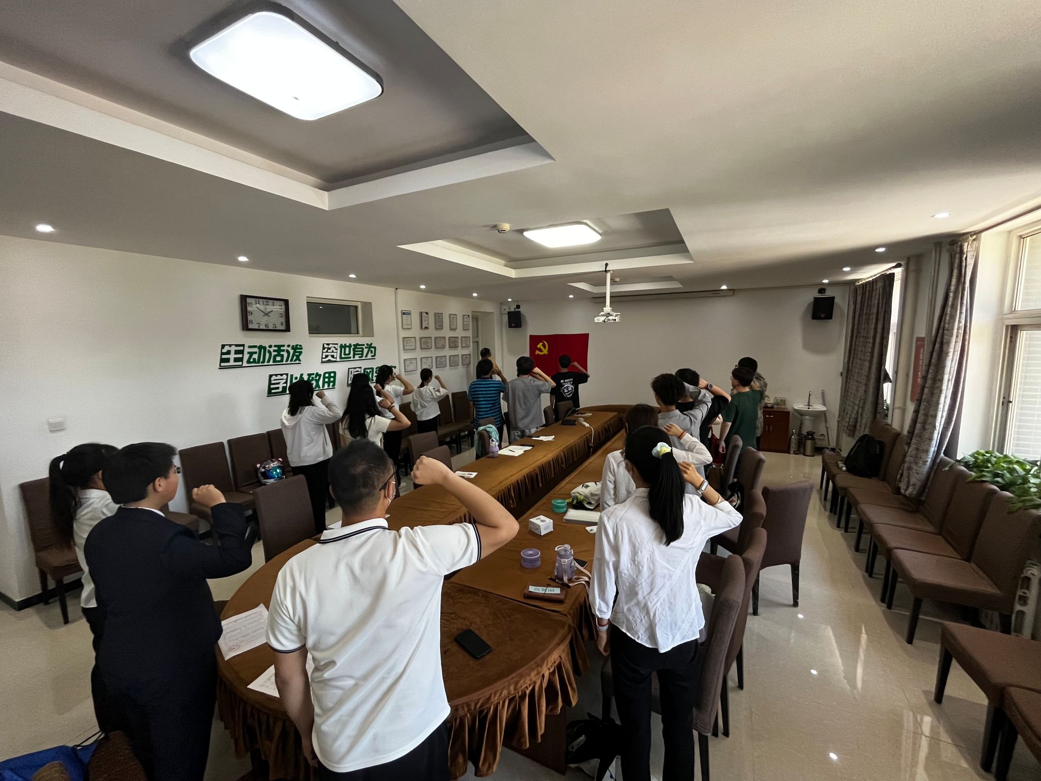 最后,党支部组织全体党员重温入党誓词。面对鲜红的党旗,党员们高举右拳,在铿锵的誓言中,党员们的初心受到洗礼,理想信念更加坚定。本次主题党日活动的成功举办,不仅让毕业生党员感受到母校的关心和温暖,更是进一步加深了支部党员之间的友谊。在离校之际,党员们更是感受到了母校始终是他们最坚强的后盾和最温暖的港湾。